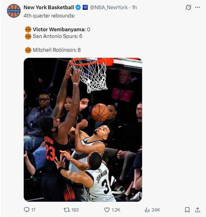 尼克斯媒體曬出末節(jié)兩隊的籃板球差距,馬刺全隊6個,而米羅一人就拼下8個,文班亞馬末節(jié)0個籃板球。